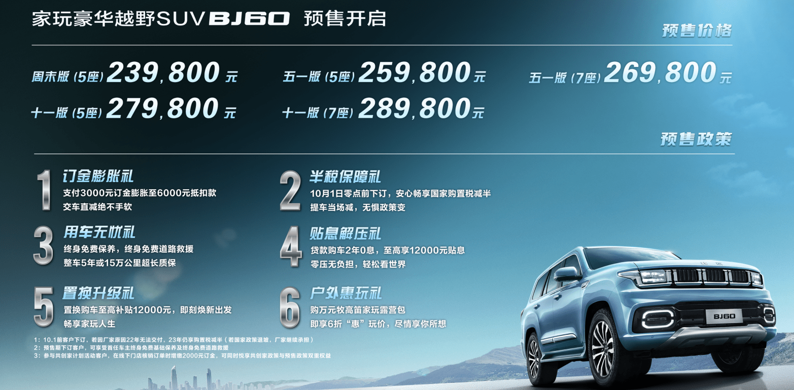 但需要注意的是用户需要在国庆10月1日前订车才能够拿满 高梯度全部六项福利,本来BJ60的预售价就让该车物超所值,厂家再推出的6大优惠政策更是让那些喜欢越野,喜欢BJ60用户可以闭着眼睛购买了。