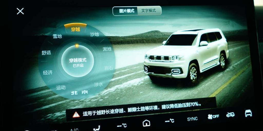 越野四驱配置方面,BJ60也是尽可能的做到应有尽有,BJ60的四驱技术方案采用的是标准的分时电控,搭载的ATS全地形系统内部预设了运动、经济和舒适3种2H模式,雪地、穿越和沙地3种4H模式,泥地、岩石和涉水3种4L模式,BJ60会根据所处的驱动模式,自行进入2H\4H\4L模式。