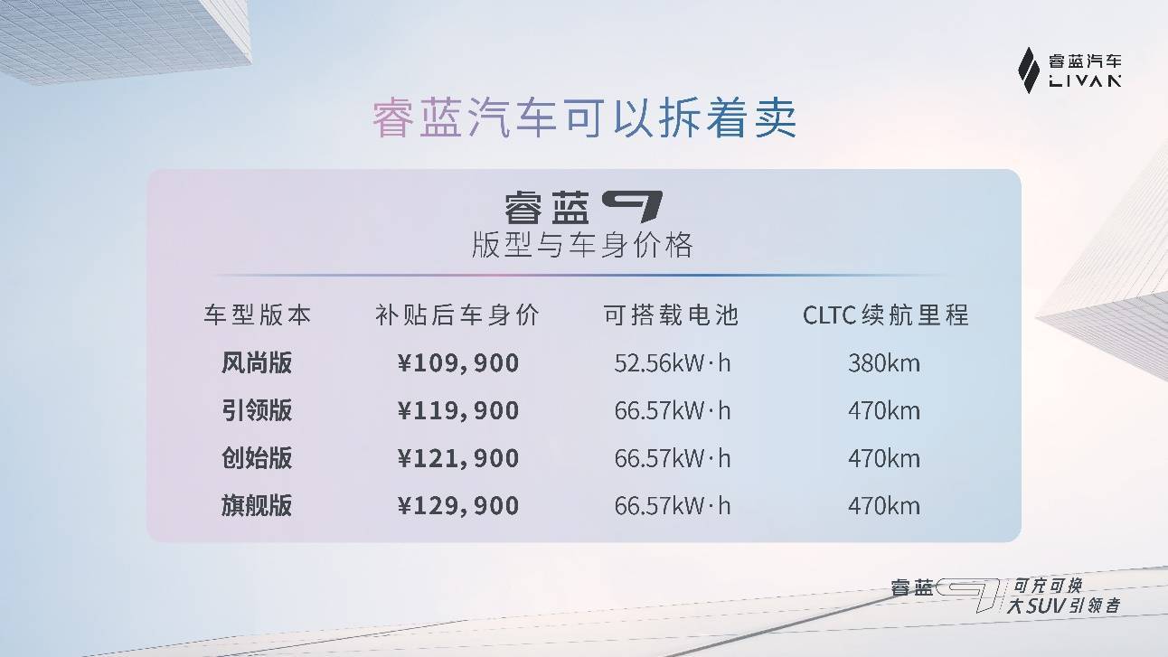 12月17日,“换电轻出行普及者”睿蓝汽车旗下可充可换大SUV引领者——睿蓝9正式上市。新车共推出风尚版、引领版、创始版、旗舰版4款配置车型,补贴后车身价格为10.99~12.99万元。同时,睿蓝9为用户提供整套动力电池解决方案,其中,包括电池订阅服务:66.57kWh电池包,月租金898元;电池金融服务:电池可以灵活分期,月供低至898元;电池买断方案:66.57kWh电池包买断价7万元,52.56kWh电池包买断价6万元。值得注意的是,此次上市发布价即国补补贴后价格,虽然国补退场,睿蓝9将把补贴进行到底!