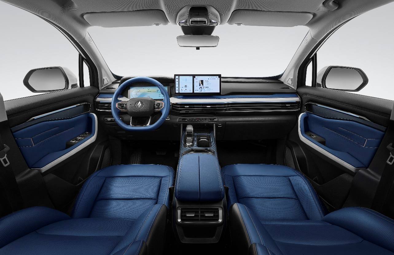 睿蓝9更注重智能化感官交互体验,堪称全维数字感官座舱。该座舱搭载了由12.3英寸液晶仪表和12.3英寸悬浮中控屏组成的车机系统,可支持三指飞屏的便捷式操作,双屏还可以与8寸W-HUD抬头显示屏实现三屏交互,科技仪式感双重满足。