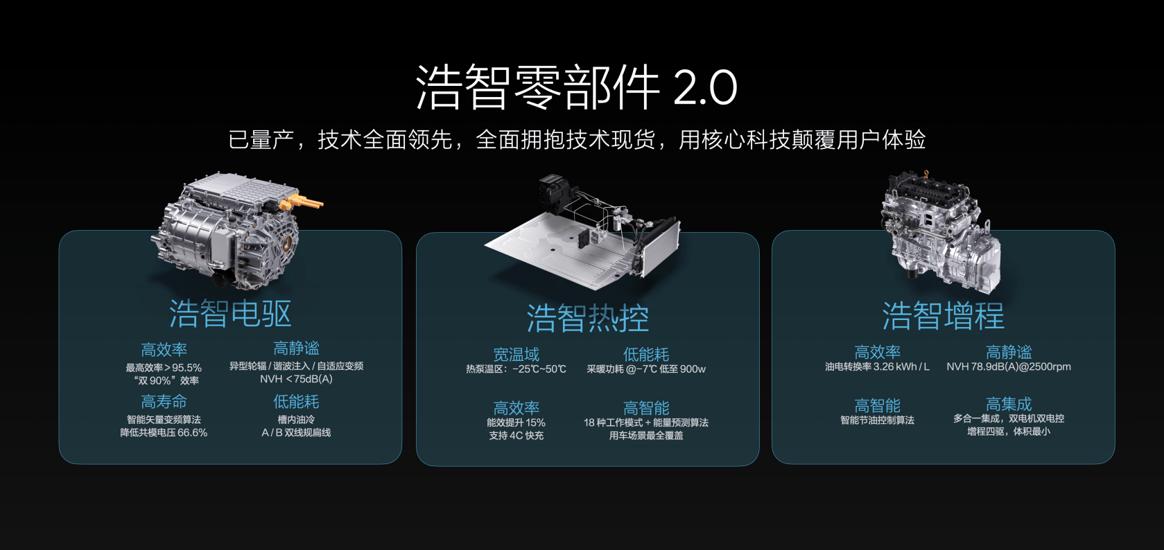 得益于已经实现量产的浩智零部件2.0技术,山海平台2.0还做好了核心部件的升级储备。以浩智电驱为例,通过行业首创的智能矢量变频算法,及异型轮辐设计、槽内油冷直喷技术等诸多技术,使得车辆的NVH、综合工况效率、整车最高续航均达到行业领先水平。
