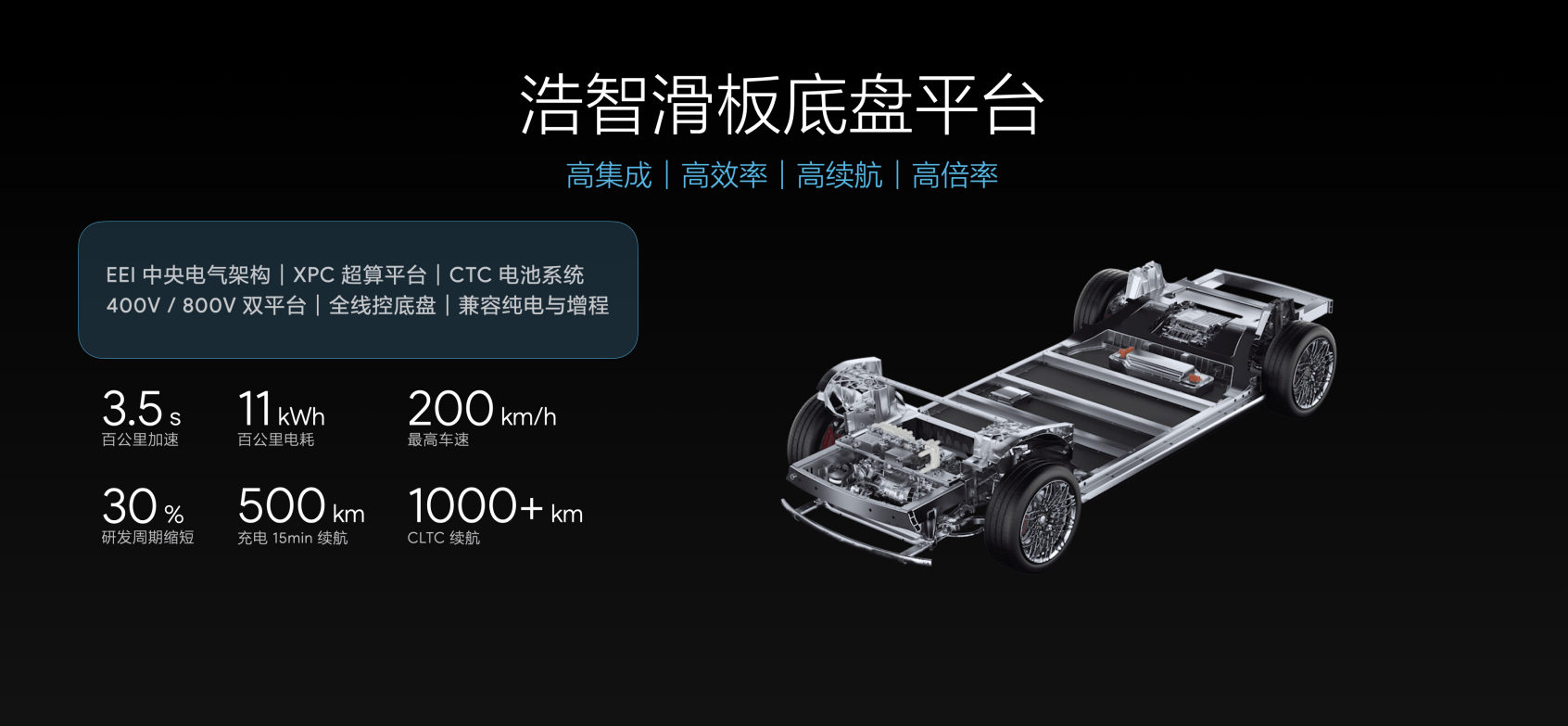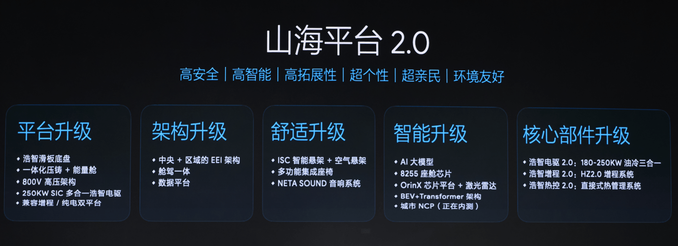本次发布的山海平台2.0,通过应用浩智滑板底盘,实现平台升级,既能让用户尽情享受3秒级百公里加速、200 km/h最高车速带来的更安全、更具操控性的驾驶体验,还能够实现1000公里以上CLTC续航里程、充电15分钟续航500公里。