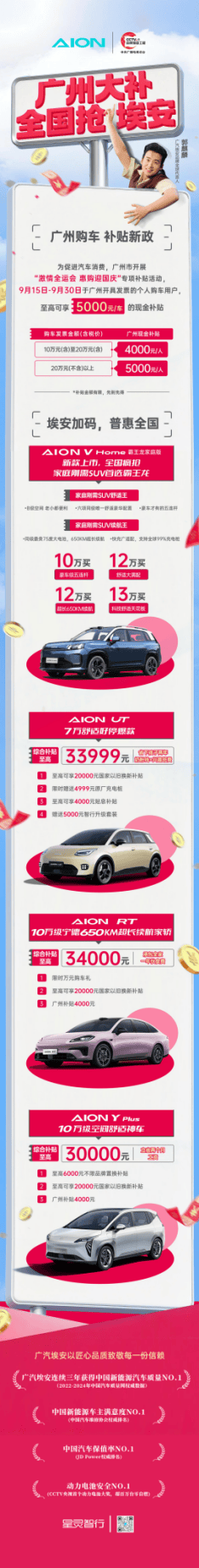 作为大湾区纯电领头羊,广汽埃安积极响应广州市政策,在政府补贴基础上推出额外加码福利,包括赠送原厂充电桩、金融贴息及专属置换补贴补贴等,叠加国家政策补贴后,至高可享3.4万元补贴。进一步助力消费者轻松购车,实现“全国同享、普惠到底”。