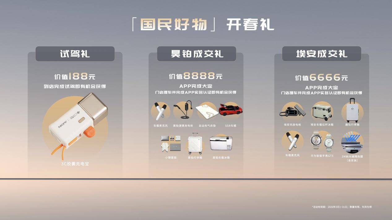 为庆祝马年新春以及三大国民系列IP正式发布,3月份,在昊铂或埃安销售门店完成试乘试驾,即有机会获得价值188元的国民好物试驾礼;完成下定,即有机会获得价值8888元或6666元的国民好物成交大礼包!