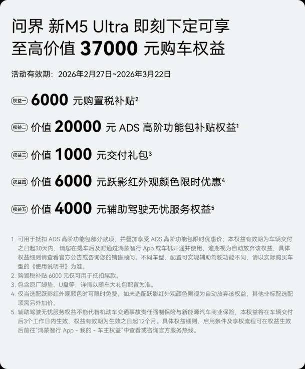 恰逢春日暖归、芳华正盛,为回馈每一份热爱与信赖,问界M5特别奉上春日献礼,2026年2月27日至2026年3月22日,下定问界新M5 Ultra即可享至高价值37000元购车权益,包含6000元购置税补贴、价值20000元ADS高阶功能包补贴权益、价值1000元交付礼包、价值6000元跃影红外观颜色限时优惠、价值4000元辅助驾驶无忧服务权益,以满满诚意,让每一位用户轻松拥享智能与舒适,奔赴一路繁花与美好。