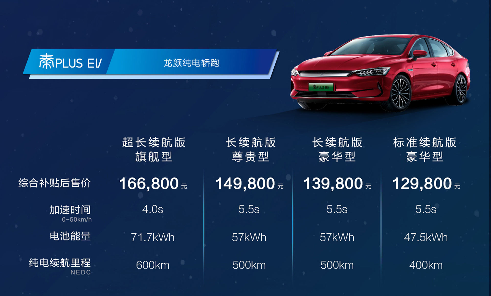 秦PLUS EV作为一款龙颜纯电轿跑,延续大放异彩的EV Dragon Face设计语言,龙须飞扬、龙睛锐利。游龙跃动腰线搭配龙腾溜背造型,整体线条饱满灵动。佩刀而来的秦PLUS EV以快和远,成为同级车中的性能表率,同时摆脱了里程束缚和充电焦虑。0到50公里加速快至4秒,远超同级的600公里超长续航,百公里电耗低至12.9度电。充电一次、通勤两周。30分钟直流快充,电量即可从30%充至80%。秦PLUS EV综合补贴后价格为12.98万元-16.68万元。