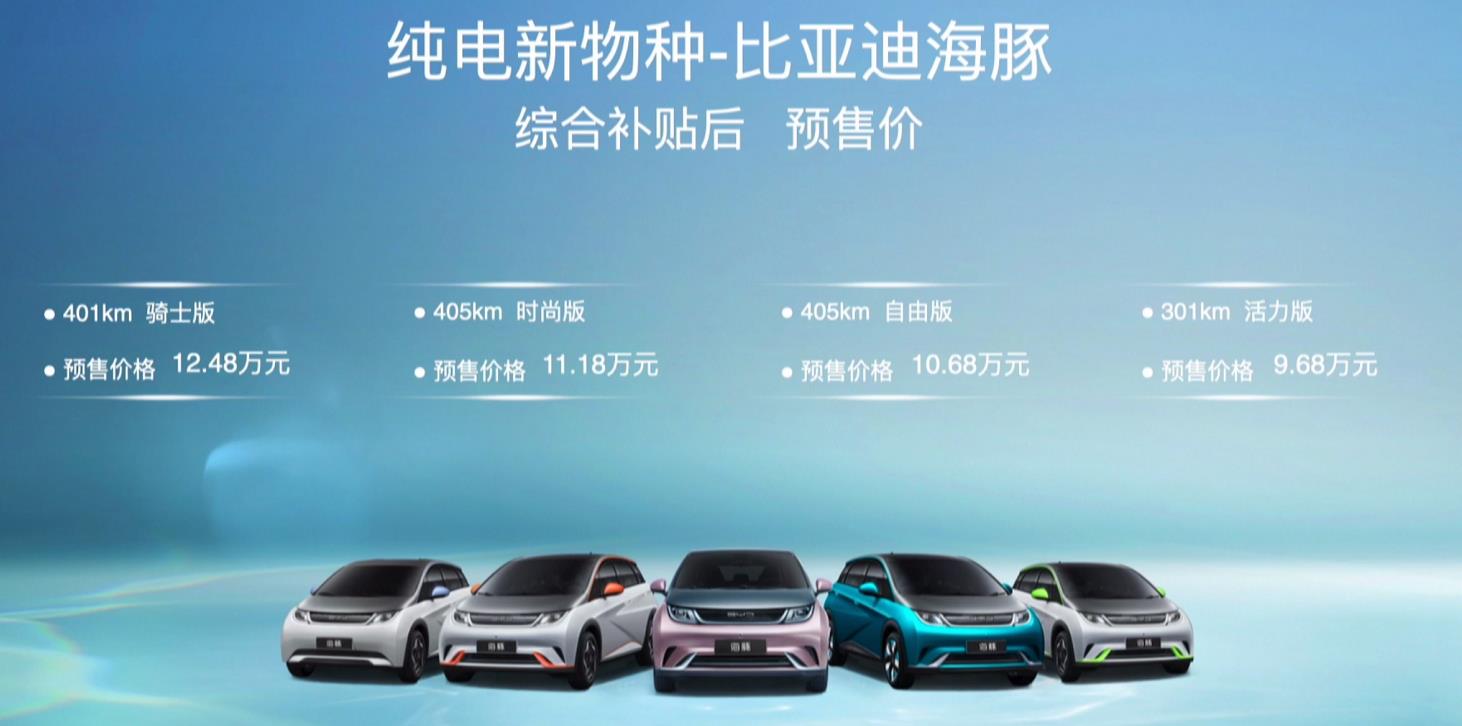 8月13日,比亚迪海洋车系正式发布。作为该车系的首款车型,比亚迪海豚的预售同步开启,共四款车型,预售价格区间为9.68万元-12.48万元,预售期下订的用户可以获得“海豚领YOUNG计划”送出的多重好礼。