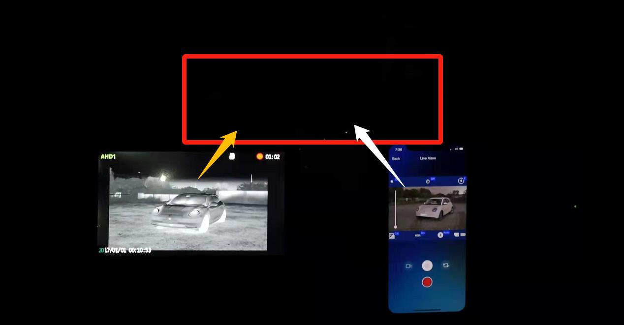 上图为暗夜环境、具备一定外界辐射照明条件,拍摄的长城欧拉好猫轮廓特征。为了将工作现场实际状态全部展现,采用第3台拍摄器材、通过三脚架固定、ISO设定为10万、测光区域聚焦在热成像仪屏幕。
