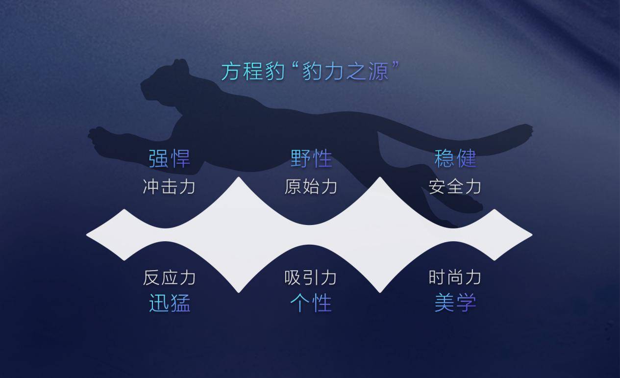 基于品牌愿景,方程豹将唤醒并滋长每个人内心野性热望的能量,聚合“强悍的冲击力、迅猛的反应力、稳健的安全力、美学的时尚力、野性的原始力、个性的吸引力”六维产品之力,打造方程豹无限扩张的“豹力之源”。