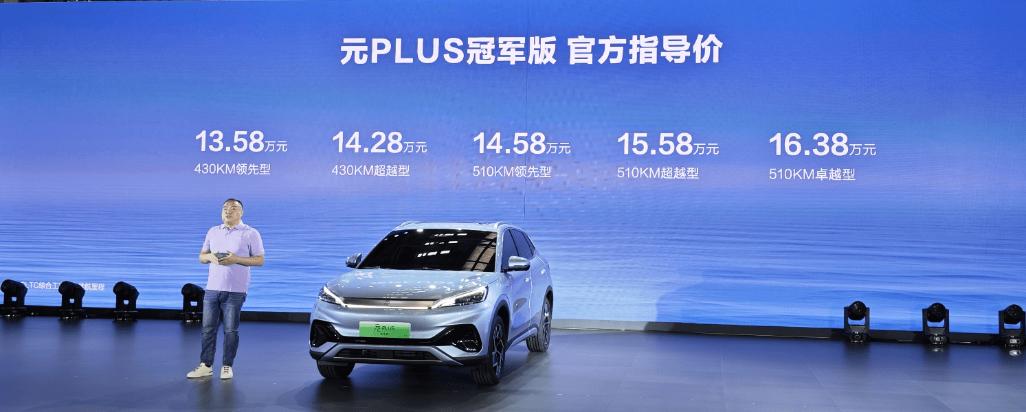 元PLUS冠军版基于比亚迪e平台3.0打造,采用高效8合一电动力总成系统和整车一体化高效热管理技术,实现电机最大输出功率150千瓦,百公里加速仅7.3秒。CLTC工况下续航里程为430公里和510公里,30%快充至80%仅需30分钟,日常通勤一周只充一次电!