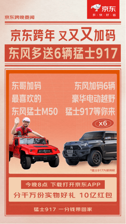 12月31日,由京东独家冠名的湖南卫视跨年晚会倾情上线,众多顶级明星齐聚一堂,带来一场精彩绝伦的视听盛宴。不仅如此,京东创始人、董事局主席刘强东将拿出自己的最爱的越野车东风猛士M50作为抽奖礼品。猛士品牌与之心有灵犀,提供6台豪华电动越野车猛士917使用权作为跨年大礼,为全国观众送上一份“新年惊喜”,助力晚会气氛达到最高潮。12月31日晚8点开始,大家只需打开京东APP,搜索“京东汽车直播”即可参与互动。