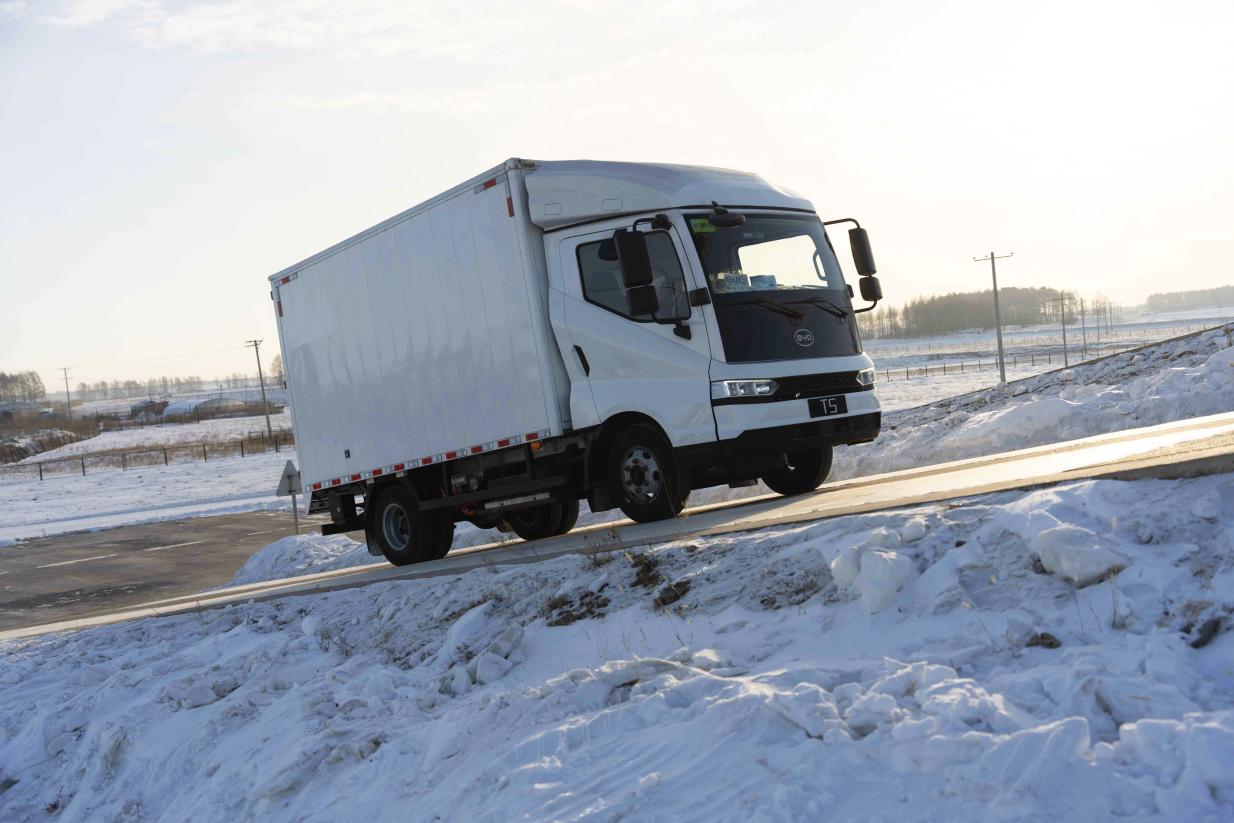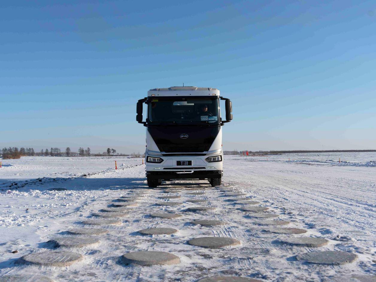 其中,低温充电和整车续航作为冬季使用场景下用户最关心的产品性能,比亚迪商用车凭借全新一代电池液冷热管理系统,让刀片电池在极寒条件下仍能维持良好充电性能,从而达到电池组的最佳运行状态,有效保证整车续航。此外,在以往极寒试验项目的基础上,比亚迪车队还新增了冰面驱动防滑、冰圆环测试、坡道停车等项目,并交出令人满意的答卷:以全新混动轻卡T5DM为例,车辆在附着力系数极低的情况下,标配的电子车身稳定系统精准介入,实施干预,保证车辆实现稳定行驶;在雪地测试中,得益于比亚迪行业首创轻卡BSC制动,T5DM制动能力大幅提升,响应速度提高4倍,紧急制动性能提升50%。