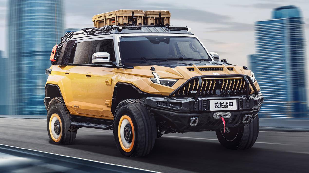 猛士917蛟龙战甲采用昂贵的航空级锻造碳纤维材料,在前后金属保杠、前机盖、车顶拓展平台等多处使用,让车身更轻、强度更高。
