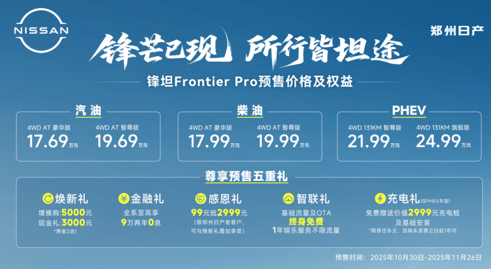 10月30日,“锋芒已现 所行皆坦途——Frontier Pro预售暨品鉴交流会”成功举办,郑州日产Frontier Pro正式开启预售,6款配置可选!锋坦Frontier Pro预售价格17.69万-19.99万元,锋坦Frontier Pro PHEV预售价格21.99万-24.99万元。