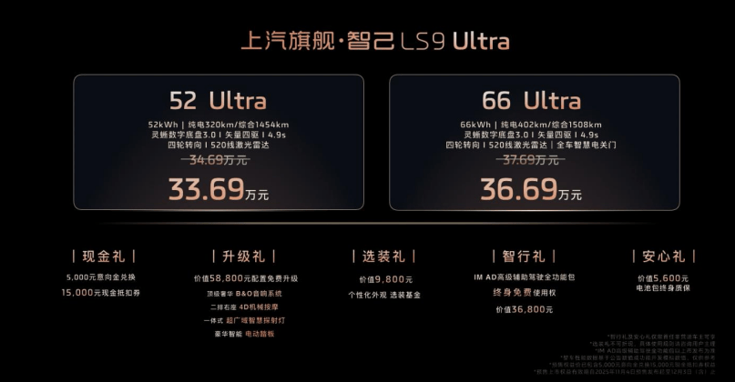 11月4日,上汽旗舰·智己LS9全球首发并正式开启预售。新车重磅首发两个超级增程版本,全系皆Ultra:52 Ultra版,预售权益价33.69万元;66 Ultra版,预售权益价36.69万元。