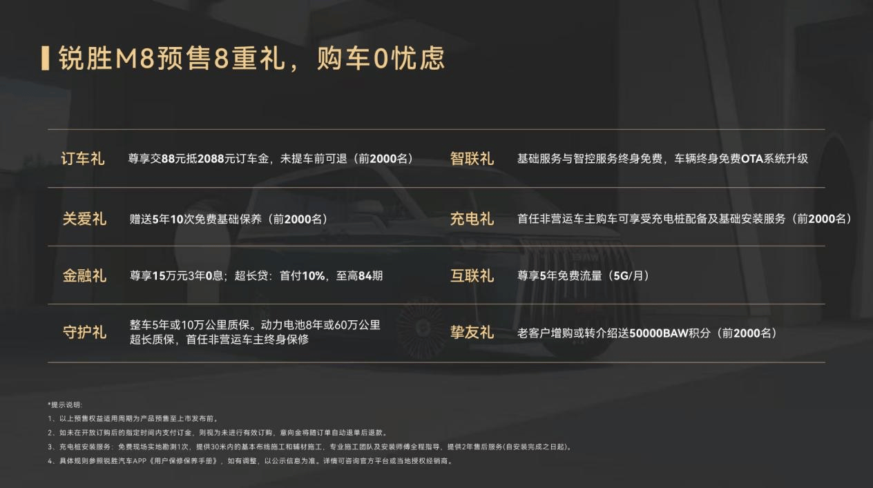 新程启幕,权益护航。预售期间下订用户可享限时权益,尊享价值至高2.98万元的八项专属好礼,全程尽享无忧体验。