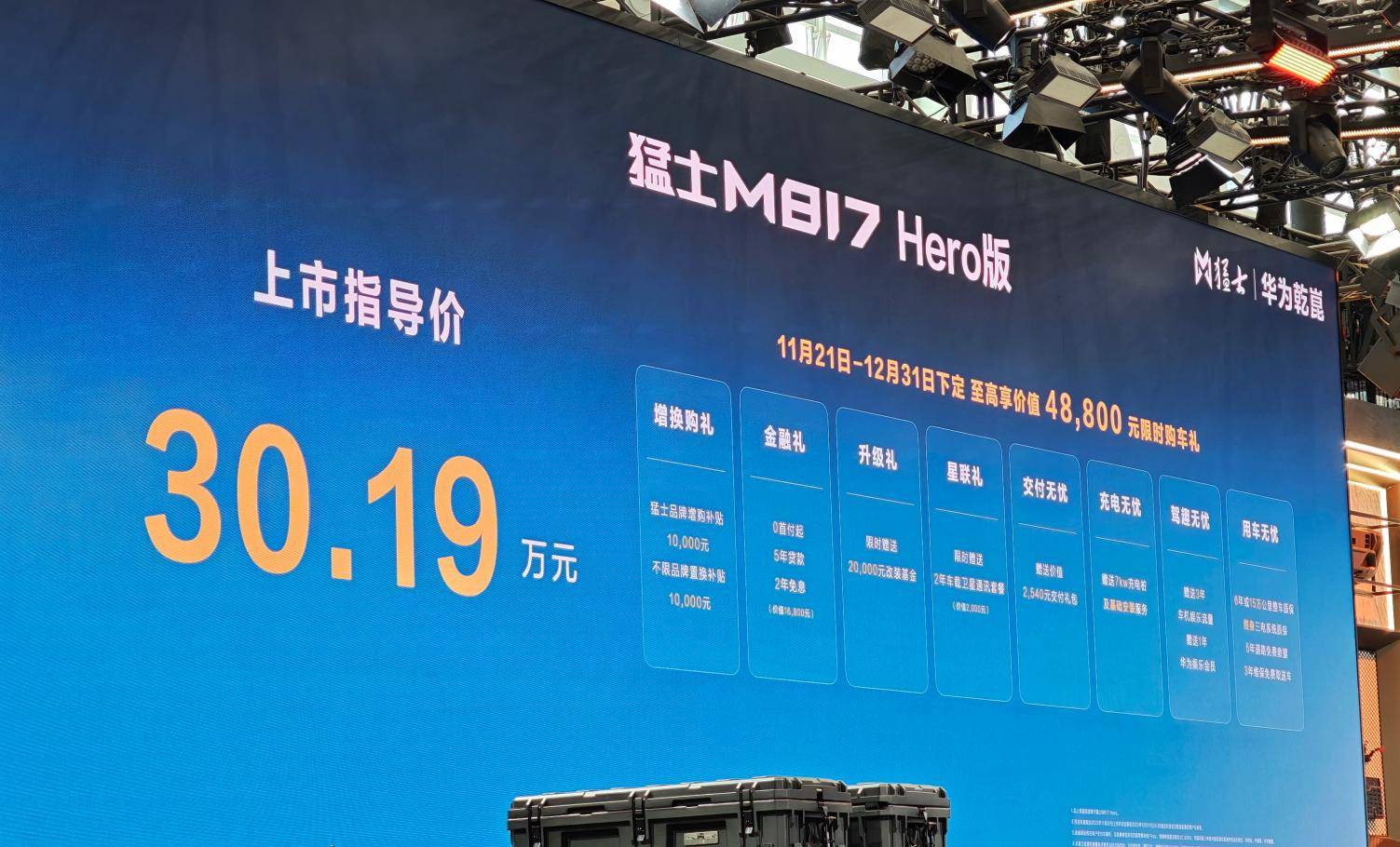 11月21日,猛士汽车与华为乾崑联合推出的豪华智能越野SUV——猛士M817 Hero版正式上市,官方指导价30.19万元。即日起至12月31日,下定可享价值48,800元的限时权益及四大基础无忧权益。新车精准解决越野爱好者“安全顾虑”与“改装难题”,以全域硬核实力成为“智能越野第一车”,满足深度探险与个性改装需求,开启“野得安心、改得尽兴”的新时代。