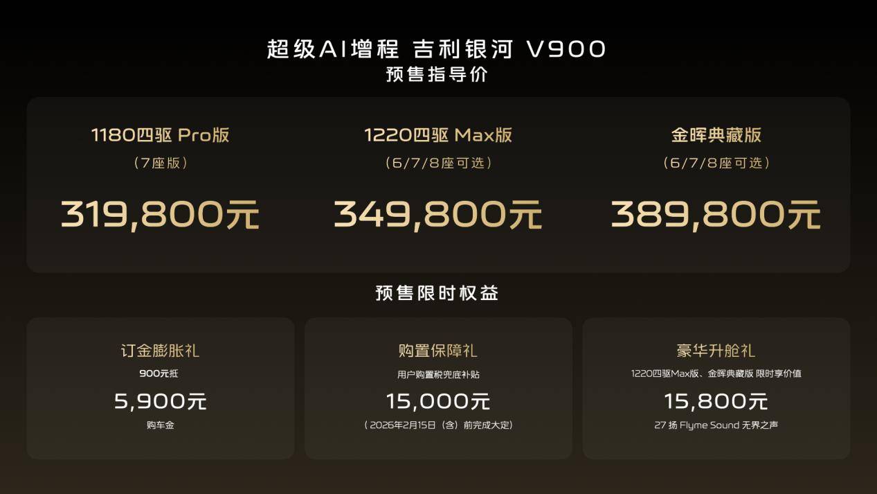 1月7日,吉利银河旗下V系列的首发之作,“AI全场景家庭旗舰MPV”——吉利银河V900正式开启预售,共计3个版本,预售指导价格区间为31.98万元~38.98万元。新车围绕中国大家庭出行的真实需求,以宽奢空间、豪华驾控、全维安全、AI智能几大全能满配实力,重新定义豪华旗舰MPV价值标准,树立AI全场景豪华出行新高度。