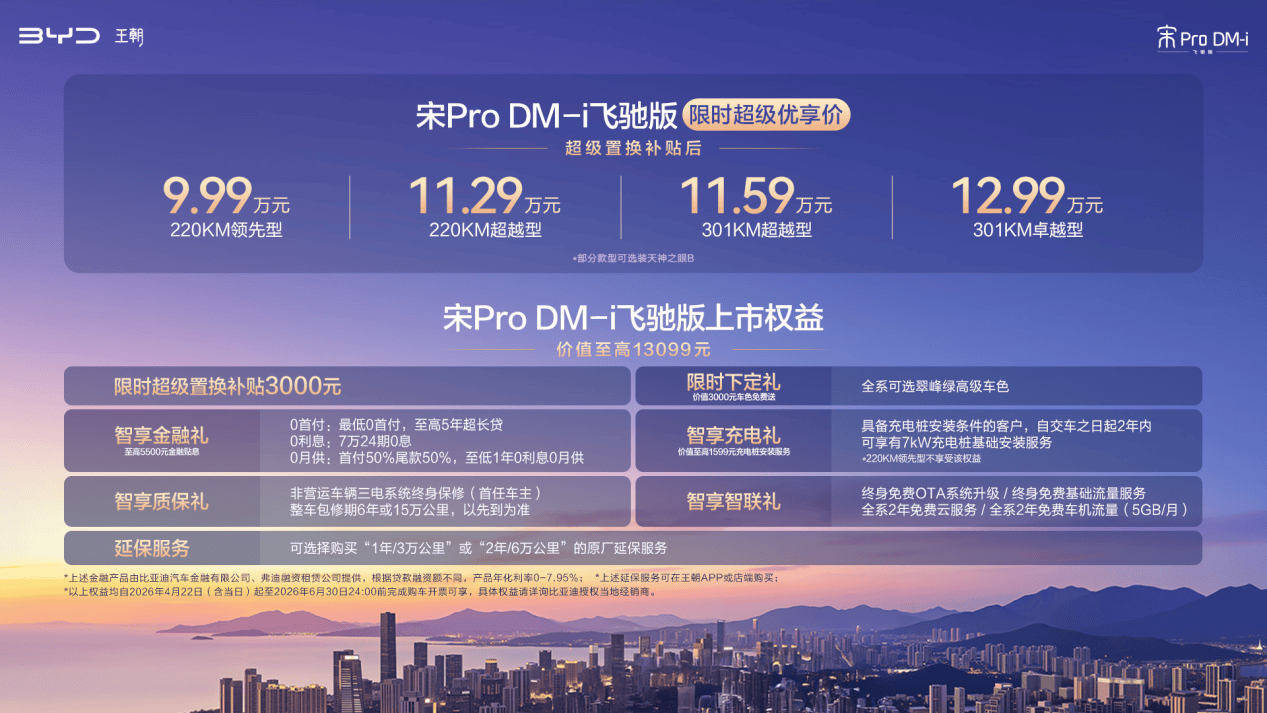 4 月 22 日,比亚迪宋 Pro DM-i 飞驰版正式上市,限时超级优享价 9.99 万 - 12.99 万元,共推出 220km、301km 两个纯电续航版本共 4 款车型,其中 220KM 领先型直接把 220km 级插混 SUV 拉入 9 万级,对 A 级插混市场形成降维打击。