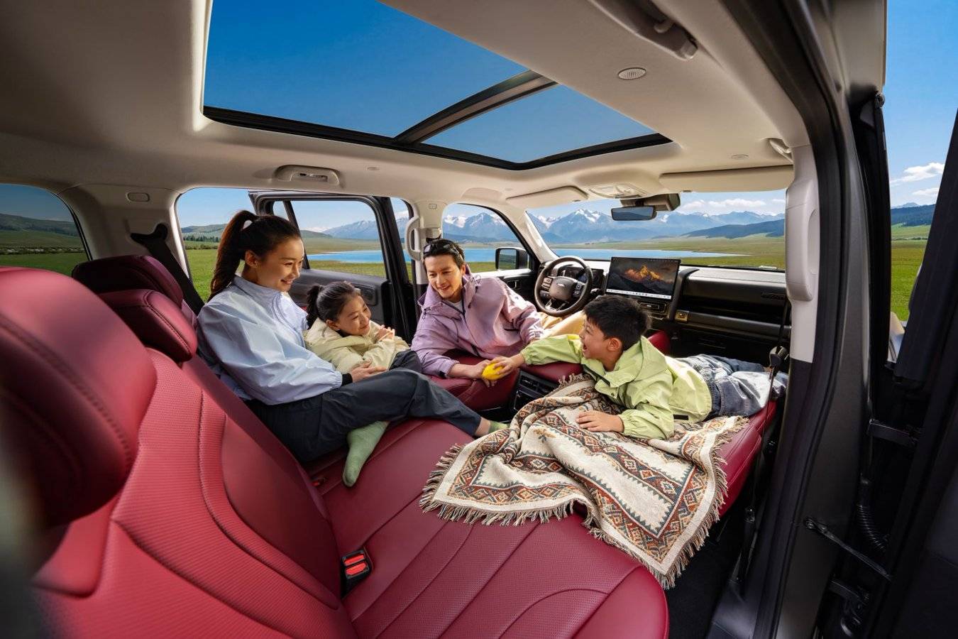 全系标配原厂黑化套件(前格栅、灯框、护板黑化),合法拉风。5座版后备厢容积达791L,配45处储物空间;后排座椅纯平放倒,秒变“移动大床房”。内饰采用熔岩红配色+软包门护板,触感亲肤。全系标配电吸后尾门,老人孩子轻关即自动吸合;方向盘加粗设计,握感更稳。主驾座椅电动8向调节,全车座椅宽大厚实。高阶静谧工程营造图书馆级宁静,LED多色律动氛围灯增添露营仪式感。