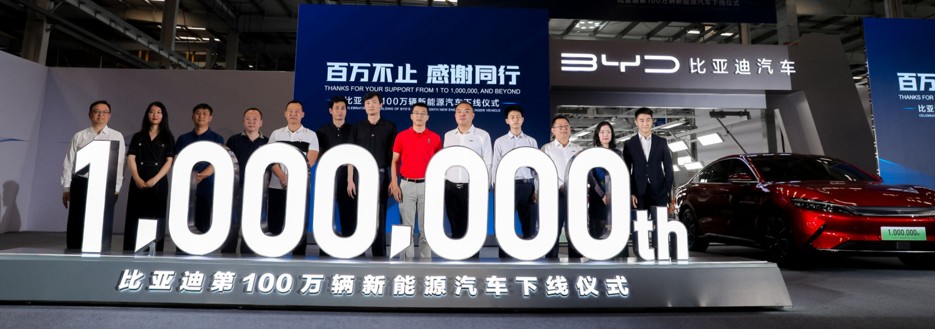 从第一辆新能源汽车到第一百万辆,比亚迪仅仅用了13年的时间。对此,比亚迪股份有限公司董事长兼总裁王传福表示:“从0到100万辆,是比亚迪引领全球汽车行业变革,交出的一份答卷;也是中国新能源汽车产业从无到有、从小到大,实现传统车大国迈向新能源汽车强国的历程。”